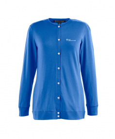 5 oz., 58% cotton, 39% modal, 3% spandex jersey; Soft modal blend drapes without clinging; Dyed-to-match grosgrain ribbon accents placket; Dura-Pearl buttons ideally spaced to avoid unflattering gaps; Banded rib knit cuffs and bottom hem; Longer 27" length (size medium) is ideal for wearing open or closed